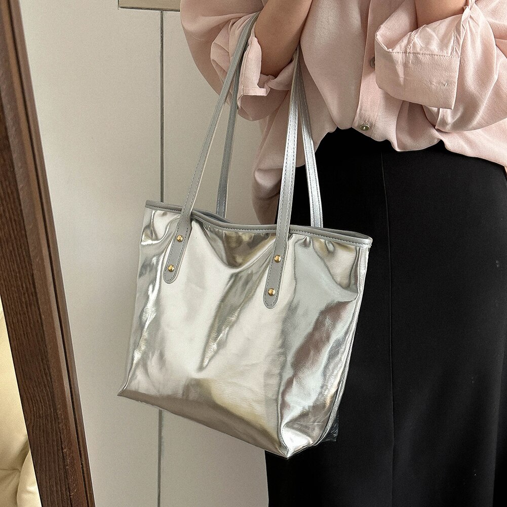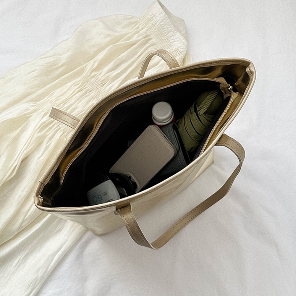 Women Fashion Top-Handle Handbag PU Female Clutch Simple Solid Color Soft Lightweight High Capacity for Travel Vacation Daily Feature: 1.Perfect Gift: This unique bag is a perfect gift for your girlfriend and friends 2.Fashion Version: Fashion version, simple and elegant, it is a fashionable shoulder bag that is perfect for pairing with your skirt and casual clothing. It will be a great choice for taking photos in the park, picnicking on the grass, and traveling on the beach. 3.Large Capacity Design: Large capacity size (11.02x10.63x4.72in)has enough space to store your mobile phone, keys, change, cards, etc. 4.Material: High quality PU material, soft and breathable,comfortable to handle. 5.Purpose: Fashion trend, light and portable, suitable for work, weekend vacation, shopping, business trip, travel, camping, hiking and other activities. Specification: Handbags Type: Shoulder Bags Number of Handles/Straps: single Department: Women Closure Type: zipper Place Of Origin: HE BEI Province Main material: PU Size: 28x27x12cm/11.02x10.63x4.72in Color: Gold/Silver(optional) Usage: one shoulder Occasion: daily, leisure, shopping, travel. Note: Due to the different monitor and light effect, the actual color of the item might be slightly different from the color showed on the pictures. Thank you! Please allow 1-2cm measuring deviation due to manual measurement.